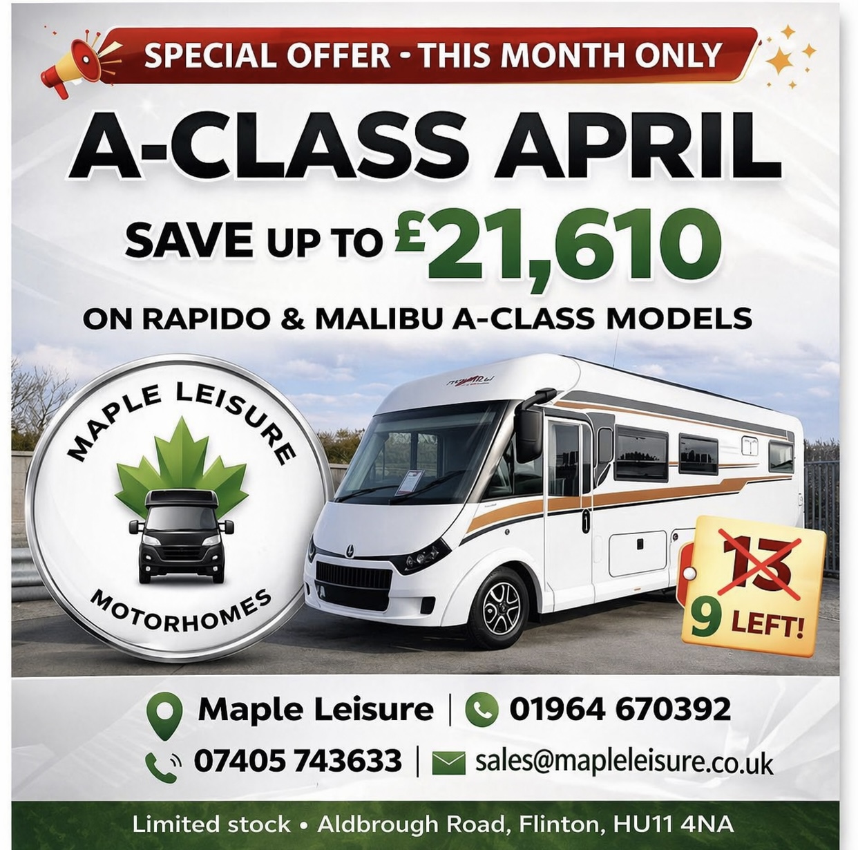 Welcome To Maple LeisureWe’re very proud to be official approved franchised dealers for Rapido and Malibu motorhomes and campervans, and WildAx campervans. Offering our customers a high-quality selection of the best leisure vehicles around, and combining that choice with outstanding customer service, means Maple Leisure in East Yorkshire is your go-to when you want to hit the road.