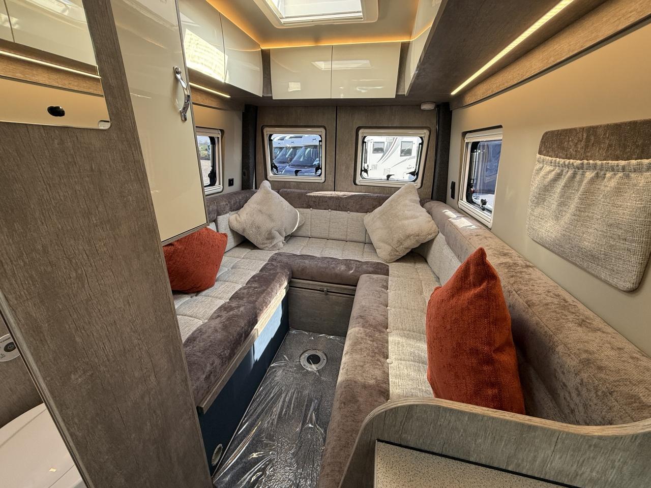 The layout gives you 4 travel seats, and 3 beds. The front area is a dinette which converts to a single bed. In the rear is a large U-shape lounge which offers 2 single or one double bed.