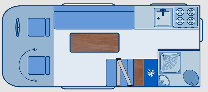 The Constellation , at 6 metres in length, offers a bright and airy 2-berth layout with 3 travel seats. The spacious lounge provides a comfortable seating area while still leaving ample room for a long, well-equipped kitchen and a perfectly sized rear washroom.